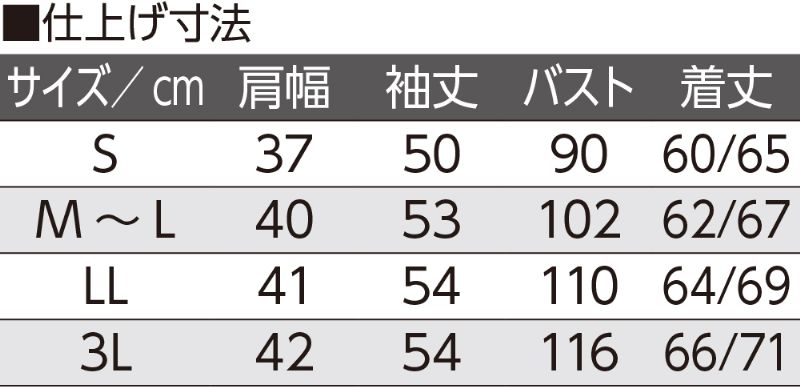 グリーン S:821425-04 M-L:821425-01 LL:821425-03 3L:821425-05サイズ等規格 ①肩幅 ②袖丈 ③バスト ④着丈